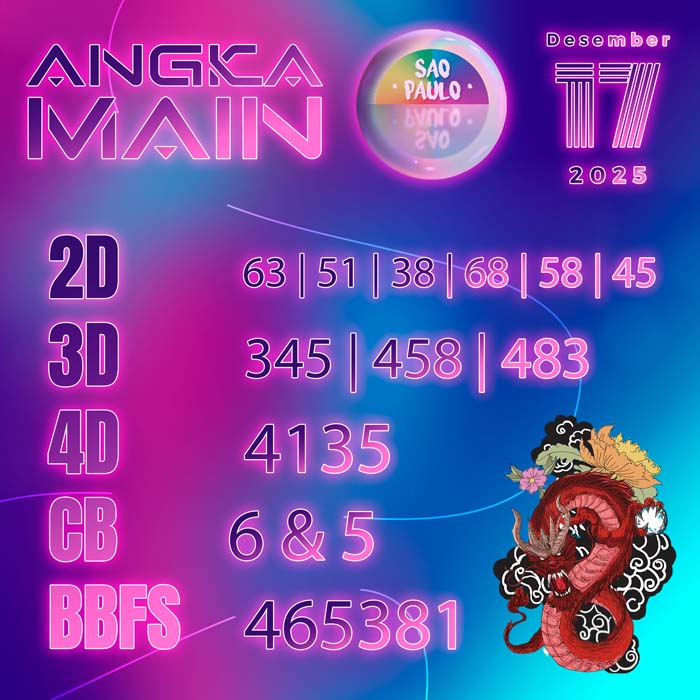 ANGKA MAIN SAO PAULO RABU 17 DESEMBER 2025 – situs yang akan memberikan PRESIKSI ANGKA MAIN dengan menggunakan rumus perhitungan yang tepat dan akurat oleh para master yang dimiliki team Togel Angka jitu untuk menghasilkan ANGKA MAIN HARI INI SAO PAULO untuk sobat tercinta semuanya.