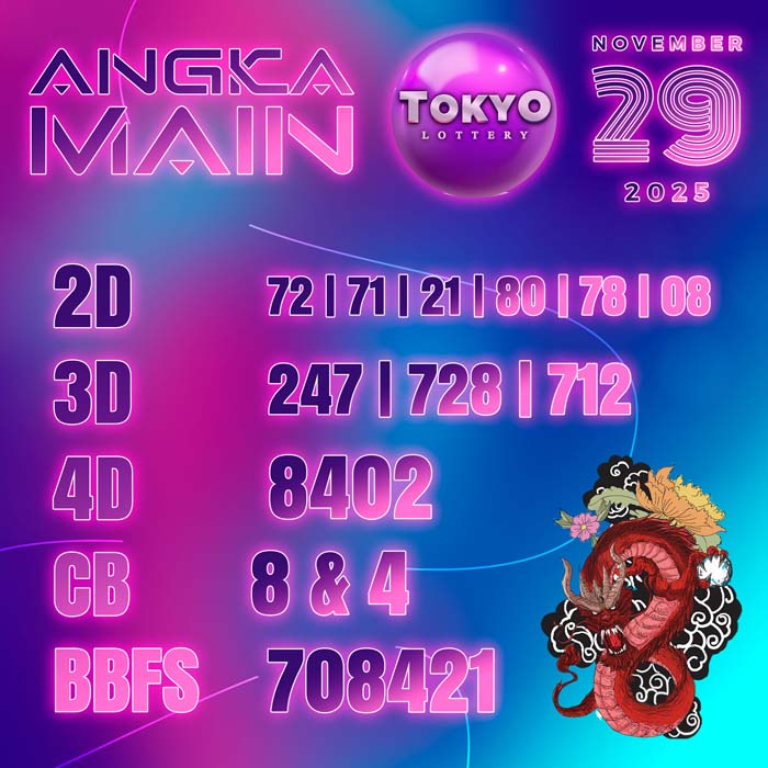ANGKA MAIN TOKYO SABTU 29 NOVEMBER 2025 – Aloha Selamat datang kami ucapkan kepada semua sobat togelers. Di sini Togel Angka main akan memberikan PREDIKSI BOCORAN ANGKA MAIN serta bocoran togel jitu hari ini yang sudah terkenal dan sudah banyak pengila togel yang memainkan pasaran ini.