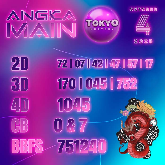 ANGKA MAIN TOKYO SABTU 4 OKTOBER 2025 – Aloha Selamat datang kami ucapkan kepada semua sobat togelers. Di sini Togel Angka main akan memberikan PREDIKSI BOCORAN ANGKA MAIN serta bocoran togel jitu hari ini yang sudah terkenal dan sudah banyak pengila togel yang memainkan pasaran ini.